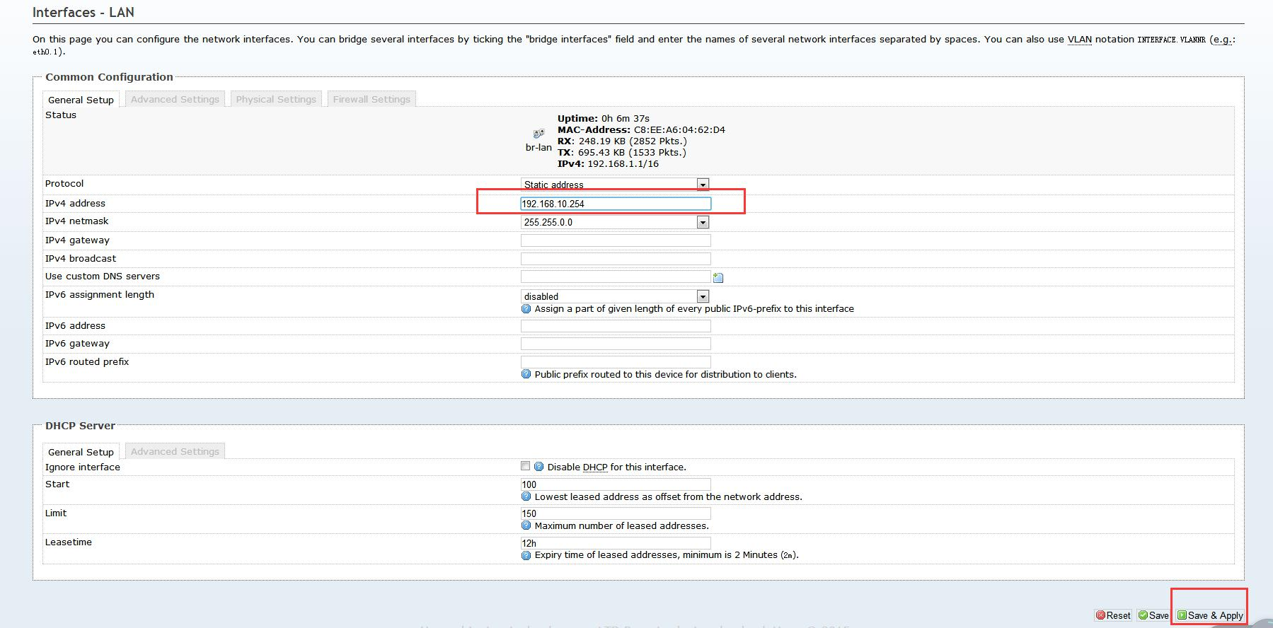 3.7 修改 IP 为 192.168.10.254 并点击“Save&Apply”。(其他配置均不需要改变)
